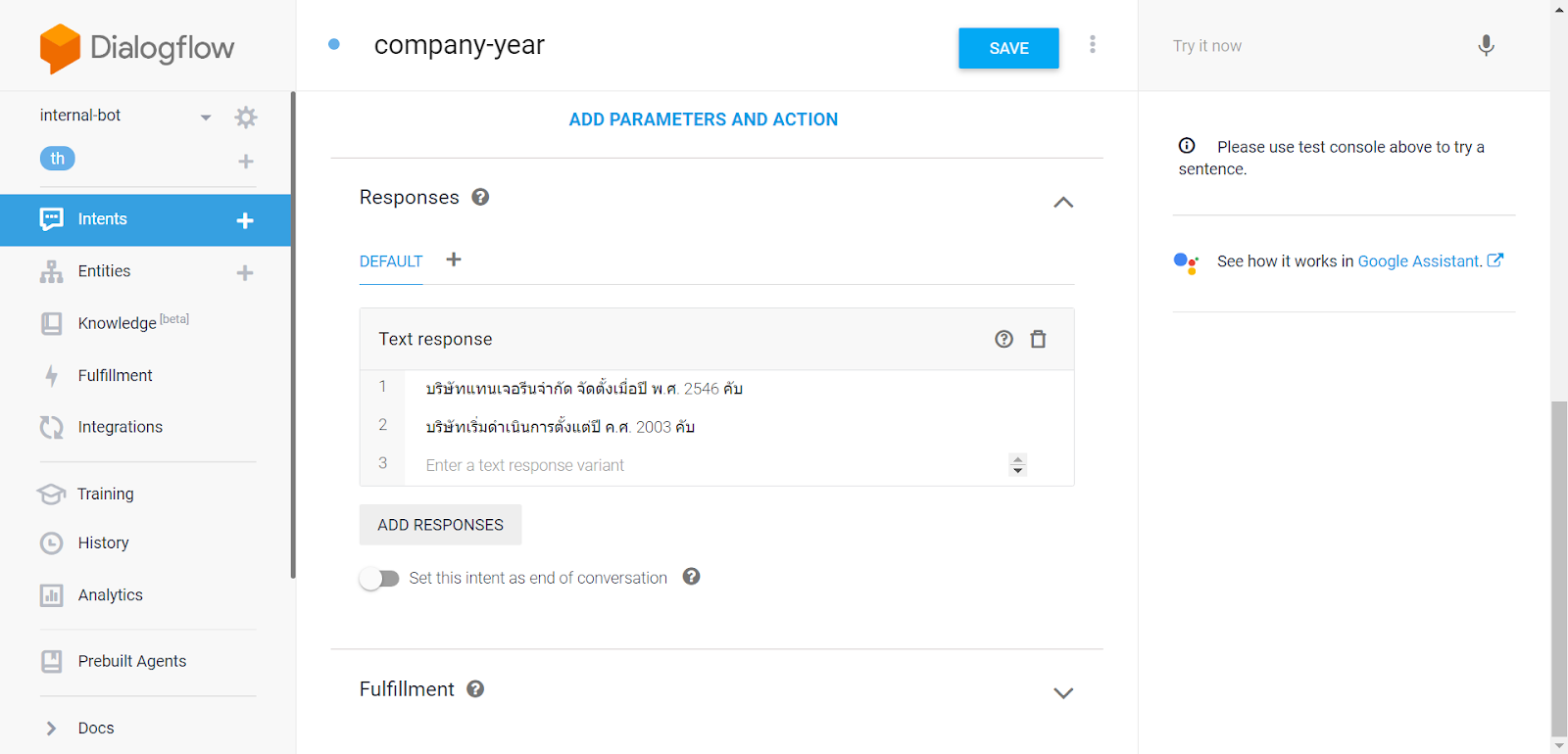 | 4) ตั้งชื่อ intent (ในที่นี้คือ company-year) และใส่ Training phrases |